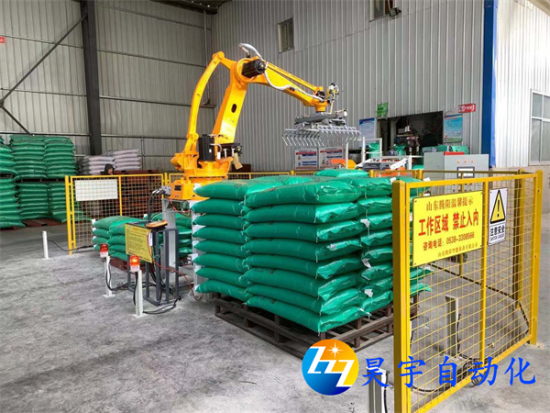 3.化肥自动码垛机系统整个系统由码垛机系统、码垛平台等组成,完成成品袋子的码垛工作。先由传送带把成品袋子输送至搬运工位,通过安装在机器人上的专用抓具,快速准确的抓取袋子,按照设定好的程序,把单个袋子码放在相应工位,再由人工辅助下由叉车搬运至成品托盘存放工位。